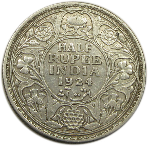 Reverse: HALF RUPEE/INDIA/1924/Hasht Ana within a double-line circle, surrounded by a scroll composed of a rose, thistle & shamrock. The Indian Lotus is placed at the top and bottom; all within a toothed border an another double-line circle.