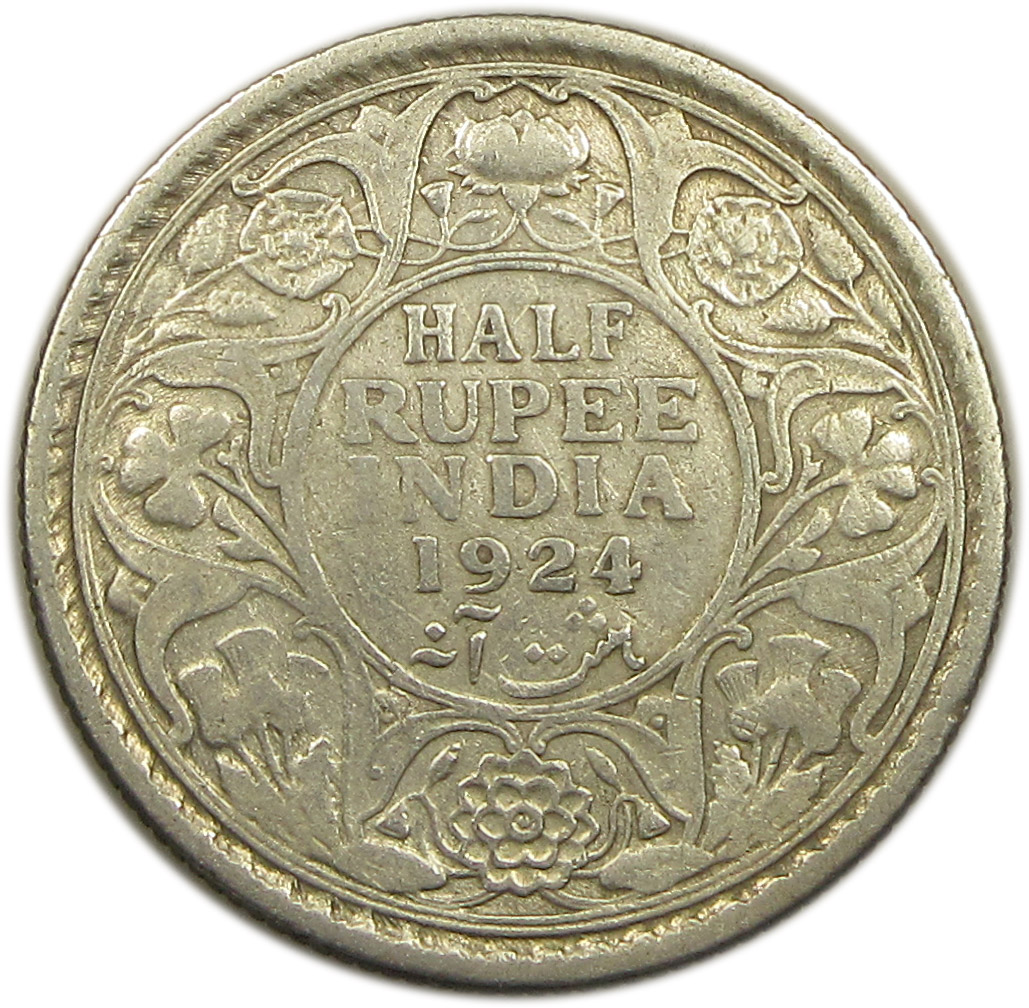 Reverse: HALF RUPEE/INDIA/1924/Hasht Ana within a double-line circle, surrounded by a scroll composed of a rose, thistle & shamrock. The Indian Lotus is placed at the top and bottom; all within a toothed border an another double-line circle.