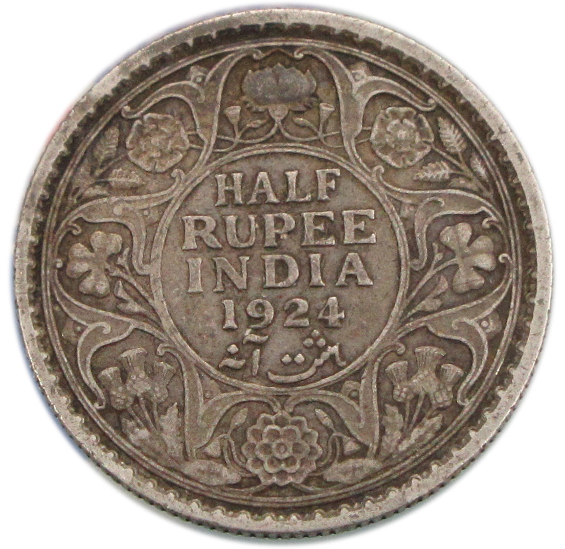Reverse: HALF RUPEE/INDIA/1924/Hasht Ana within a double-line circle, surrounded by a scroll composed of a rose, thistle & shamrock. The Indian Lotus is placed at the top and bottom; all within a toothed border an another double-line circle.