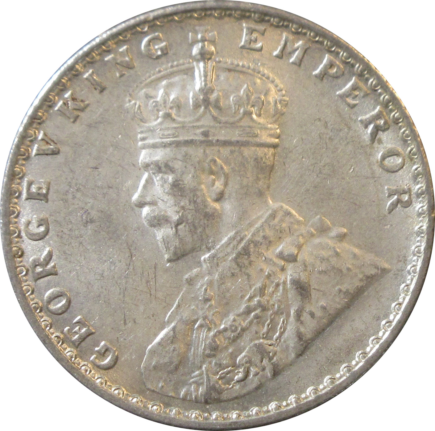 Obverse: Crowned and robed bust of King George V facing left with Legends GEORGE V KING EMPEROR around it.