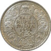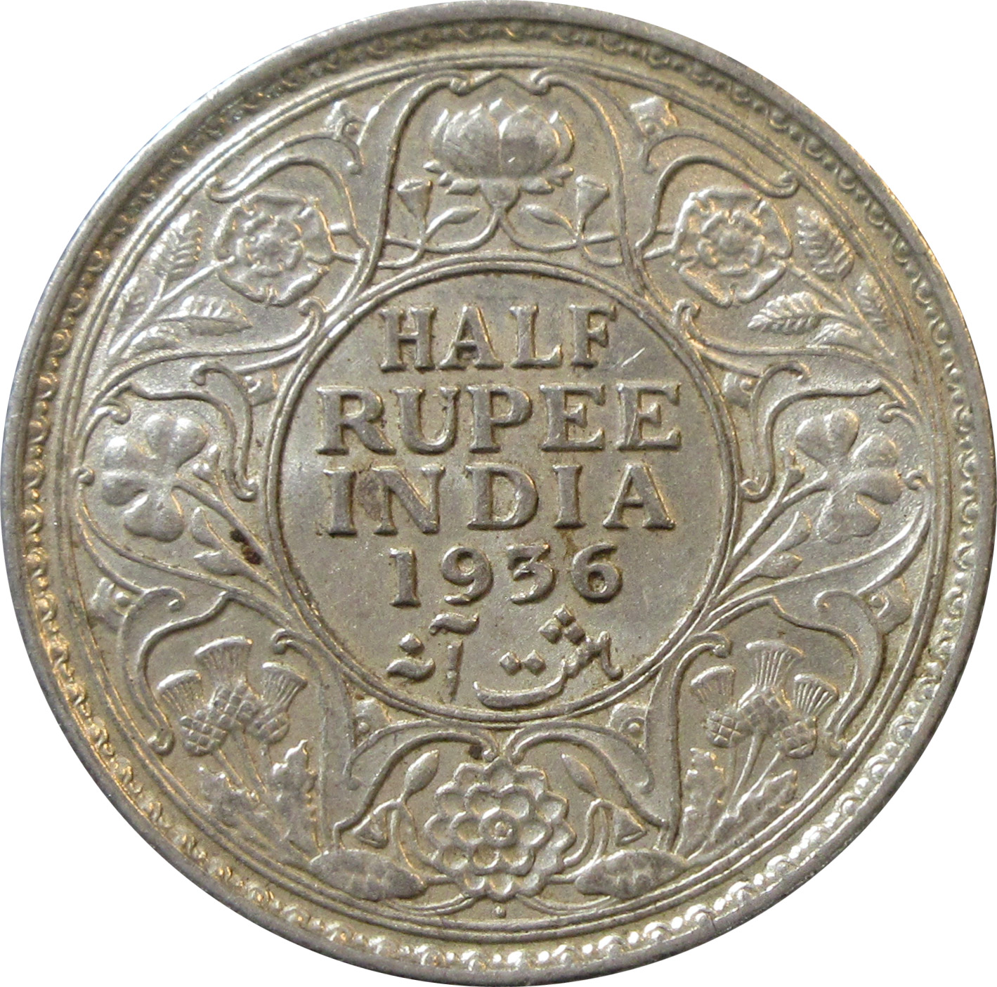 Reverse: HALF RUPEE/INDIA/1936/Hasht Ana within a double-line circle, surrounded by a scroll composed of a rose, thistle & shamrock. The Indian Lotus is placed at the top and bottom; all within a toothed border an another double-line circle.