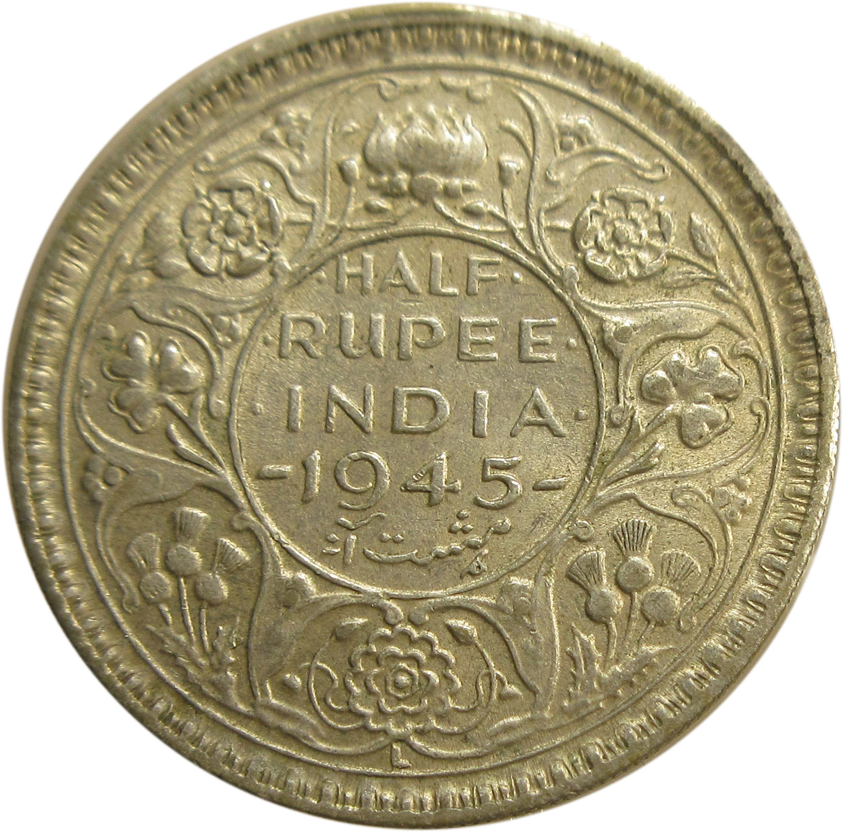 Reverse: HALF RUPEE/INDIA/1945/Hasht Ana (Persian) within a single line circle, surrounded by a scroll composed of a rose, thistle & shamrock. The Indian Lotus is placed at the top and bottom with 2 different representations. All within a toothed decorative border an another plain-line circle.