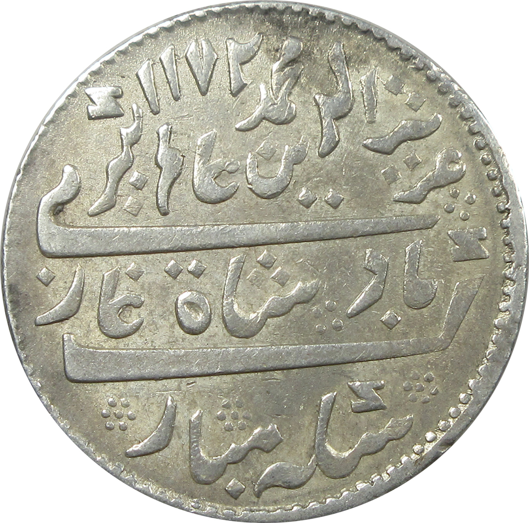 Obverse: Beaded border around Persian Legend – ‘1172 Sikka Mubarak badshah ghazi Aziz-ud-din Muhammad Alamgir’