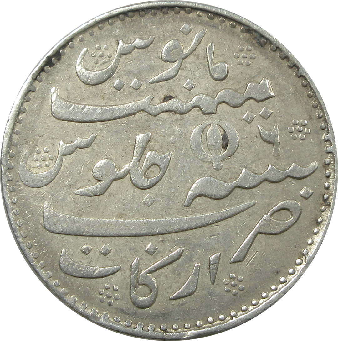 Reverse: Beaded border around Persian Legend: ‘Zarb Arcat sanat 6 julus maimanat manus’